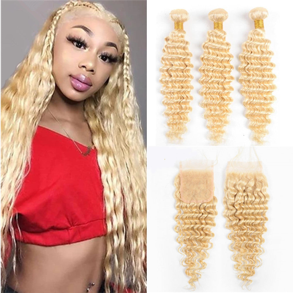 Wolf king 613# deep wave 3 bundles with 4*4 HD transparent closure virgin human hair weft