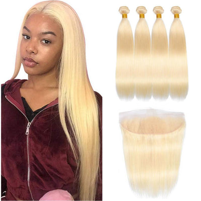 Wolf king 613# straight wave 4 bundles with 13*4 HD transparent frontal virgin human hair weft
