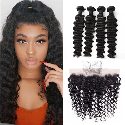 Wolf king deep wave 4 bundles with 13*4 HD transparent frontal natural color virgin human hair weft