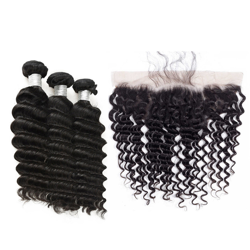 Wolf king deep wave 3 bundles with 13*4 HD transparent frontal natural color virgin human hair weft
