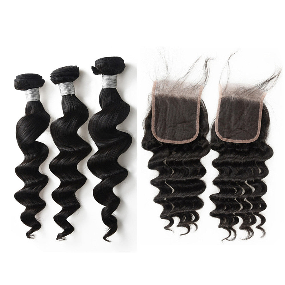 Wolf king loose wave 3 bundles with 4*4 HD transparent closure natural color virgin human hair weft
