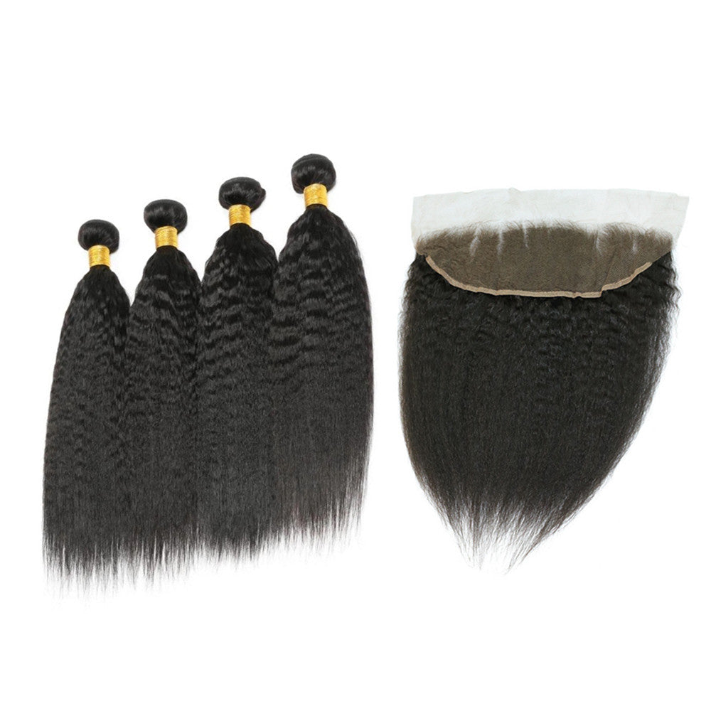 Wolf king kinky straight wave 4 bundles with 13*4 HD transparent frontal natural color virgin human hair weft